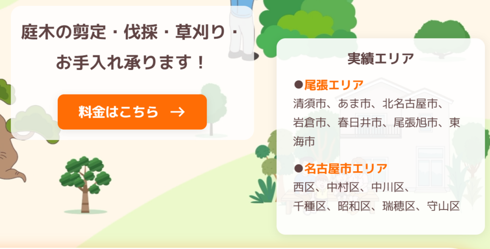 「作業実績ある地域(ホームページトップ画像)」は、清須市・あま市・海部郡・岩倉市・春日井市・東海市などの尾張地区。名古屋市内では、西区・中村区・中川区・千種区・昭和区・瑞穂区などです。